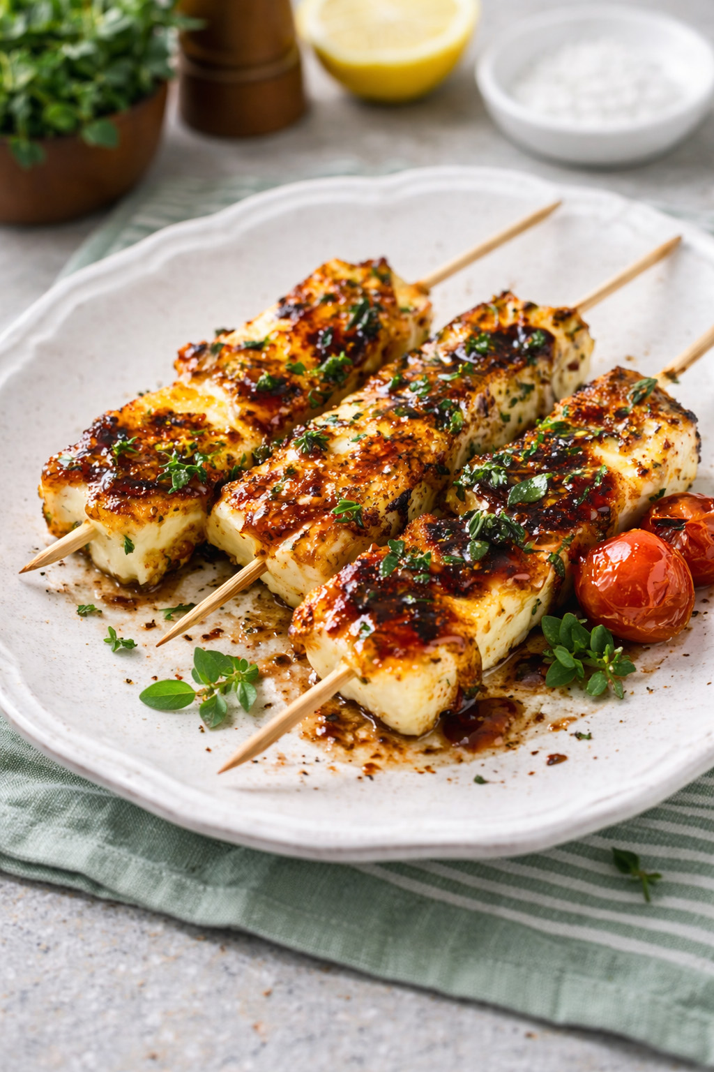 • Halloumi – The star of the show. Firm, squeaky, and made for the grill—crisps up beautifully without losing its shape.