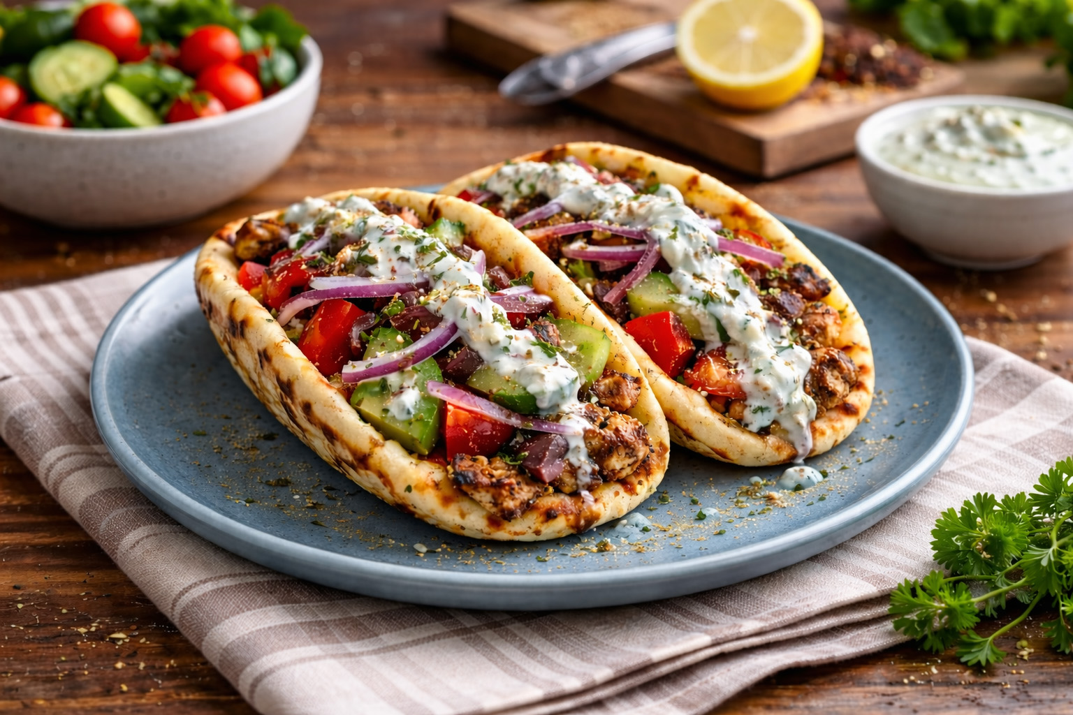 Fast, fresh, and gloriously Greek-inspired — these warm pita tacos are piled high with herby chicken, vibrant vegetables, crumbly feta, and a silky drizzle of tzatziki.
