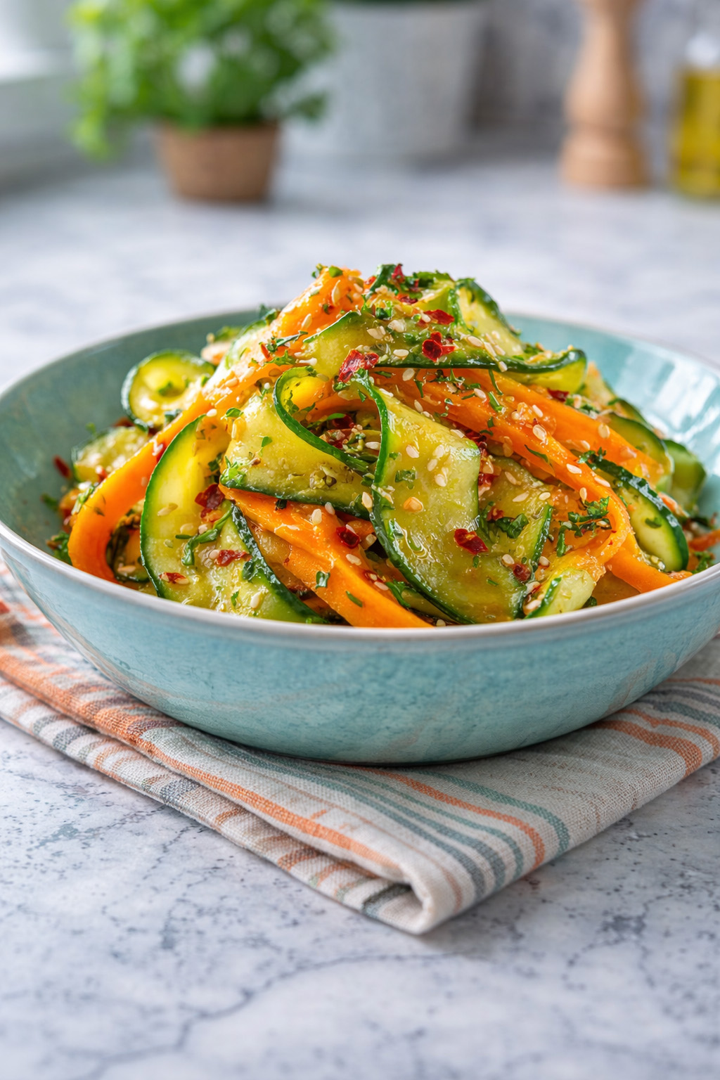 This one’s all about crunch, colour, and a little kick to keep things interesting. Crisp ribbons of cucumber and sweet, snappy carrot come together in a bowl that feels fresh, bright, and just a bit addictive. Then comes the magic — a garlicky, sweet-heat dressing with a gentle chilli warmth that clings to every bite and wakes everything up.